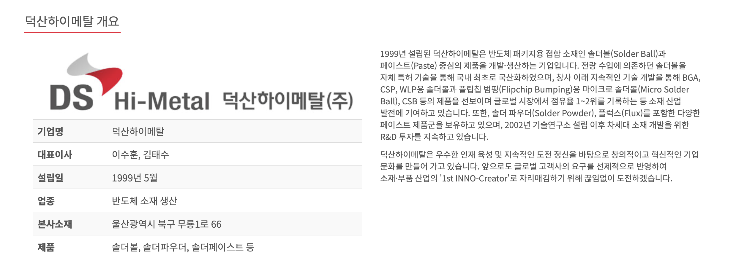 안녕하세요! 오늘은 세계 2위의 솔더볼 시장 점유율을 바탕으로 반도체 후공정 소재 시장을 주도하고, 자회사 덕산넵코어스를 통해 방산 및 우주항공 분야로 영토를 확장 중인 덕산하이메탈(077360)을 분석해 보겠습니다.