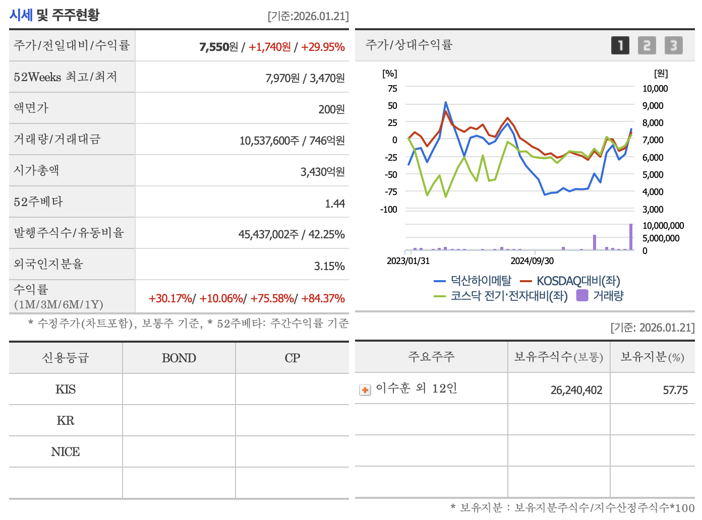 - 이수훈(대표이사) 및 덕산홀딩스: 약 45~50% (안정적인 경영권 및 책임 경영 체제)