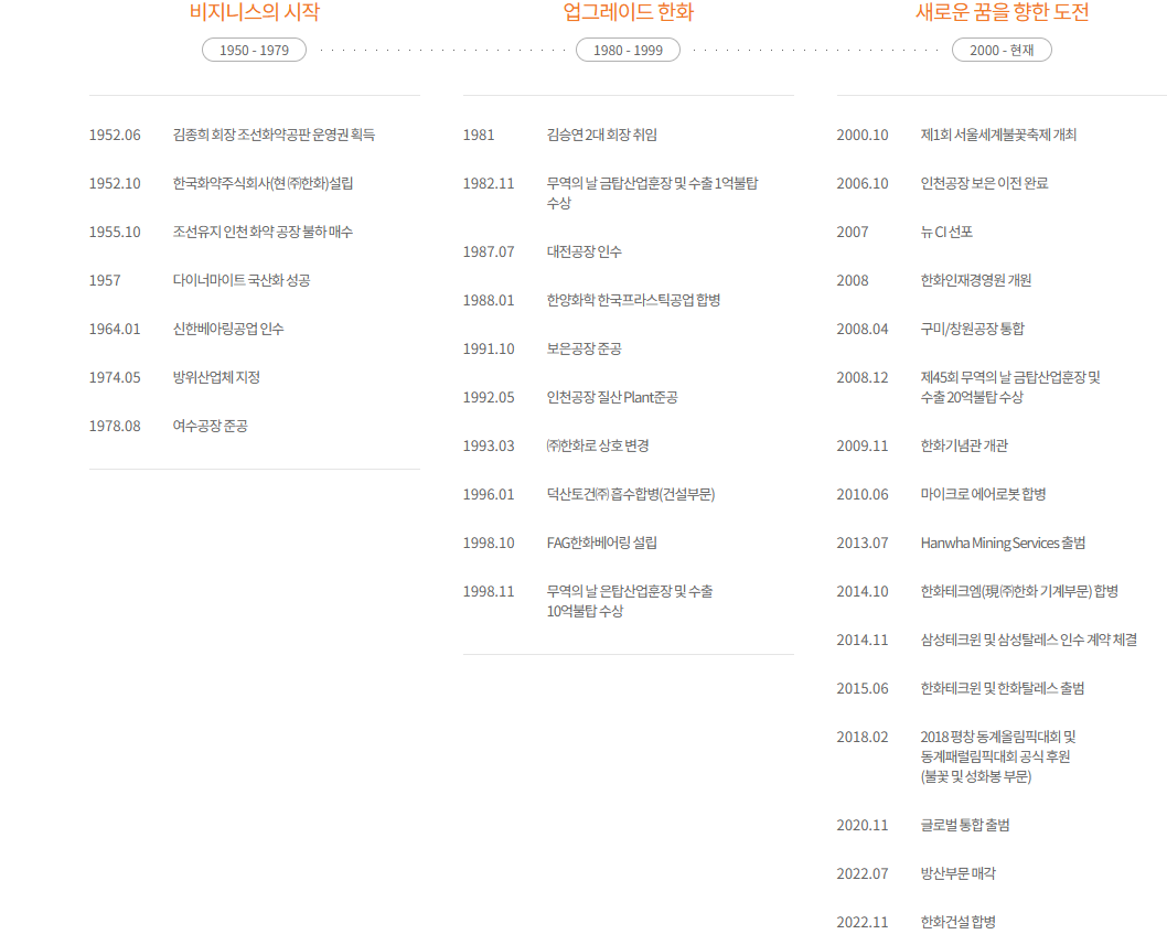 - 2023년: 한화오션(구 대우조선해양) 인수를 통해 해양 방산 밸류체인 완성.