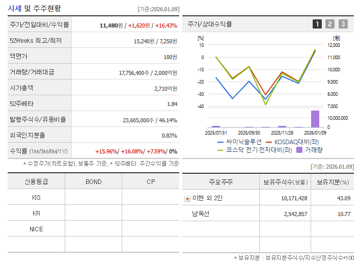 - 현재가: 11,480원 (2026년 1월 9일 종가 기준)