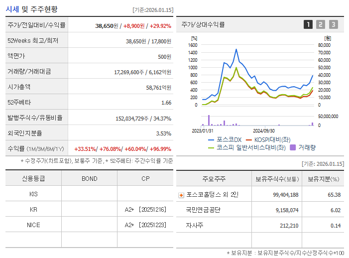 - 포스코홀딩스(최대주주): 65.4% (강력한 그룹사 지원 및 책임 경영)
