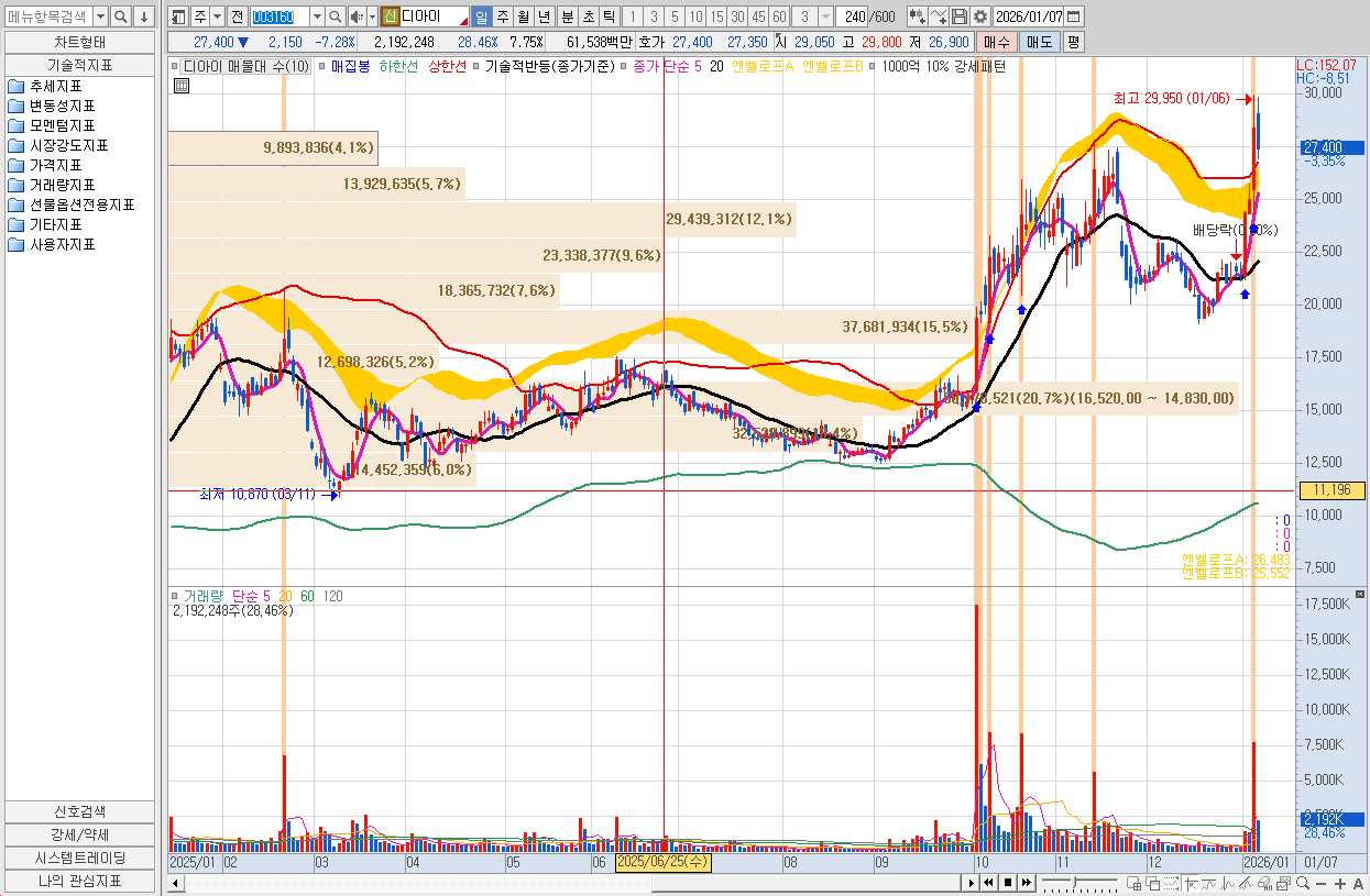 디아이는 더 이상 테마주가 아닌, HBM 슈퍼사이클의 핵심 실적주입니다. 2026년 실적 기준으로도 성장성 대비 저평가 구간이라는 평가가 우세합니다.