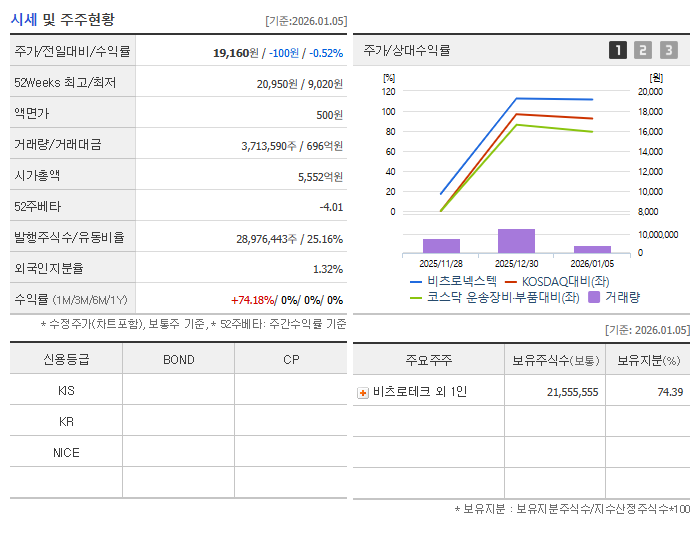 | 최대주주 | 비츠로테크 (82.0%) - 안정적인 지배구조 및 모기업 지원 |