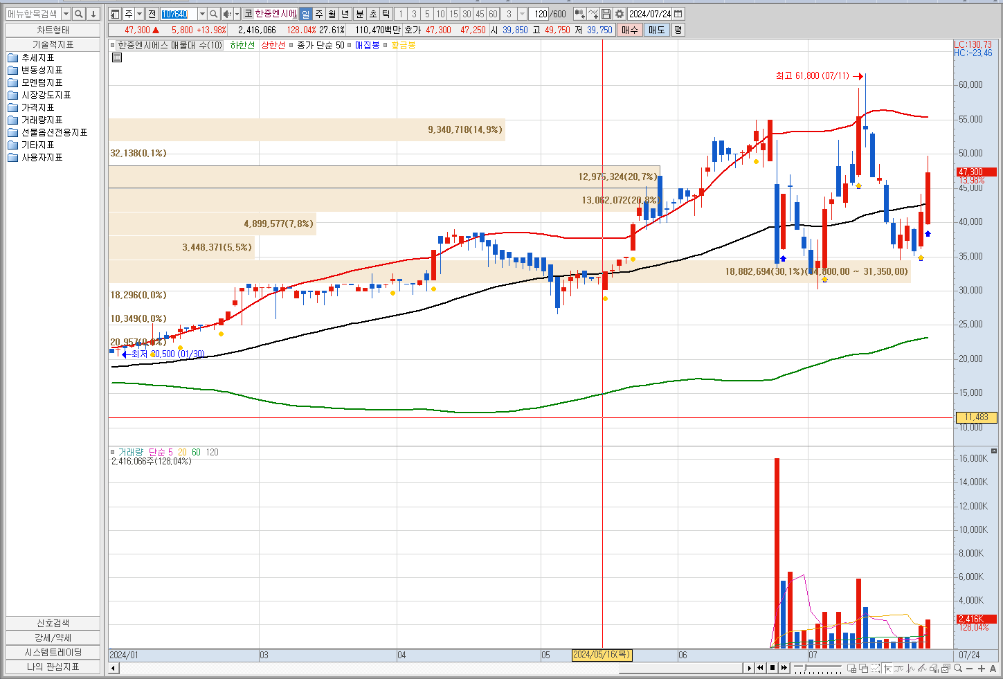 240724일 기준 현재가 47,300원 계속해서 우상햐을 하고 있다. 6월 24일 엄청난 거래가 터지고 61,800원 고점을 갔다가 다시 도전 중이라 볼 수 있다. 현재 상황에선 가장 핫한 종목이라 할 수 있다.