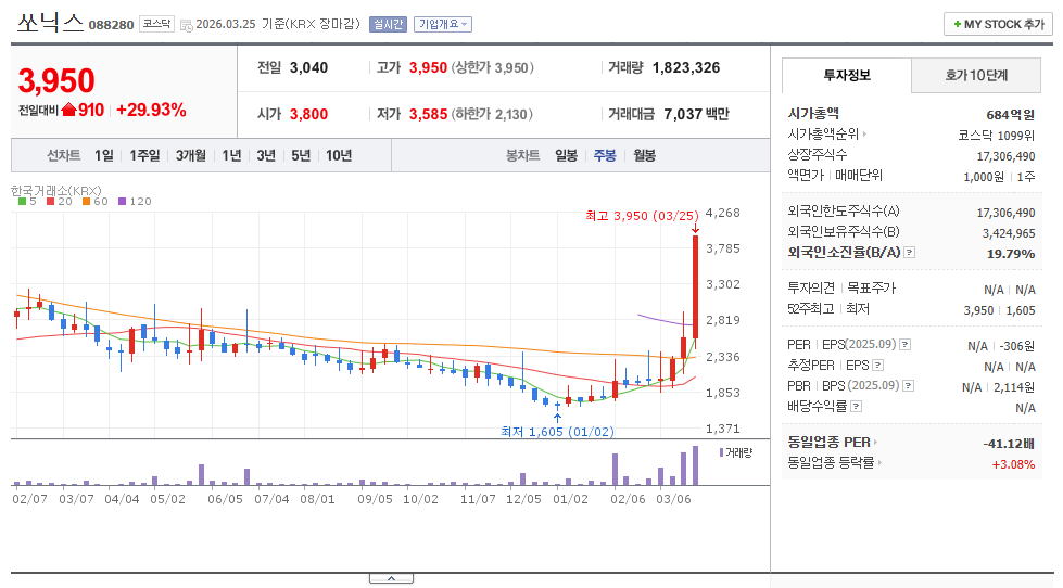 현재가 3,950원은 바닥 탈출의 초입입니다. 4,000원 이하에서 비중을 나누어 매집하고, 4,500원 돌파 시 거래량이 실리는지 확인하며 홀딩하는 전략이 유효합니다.