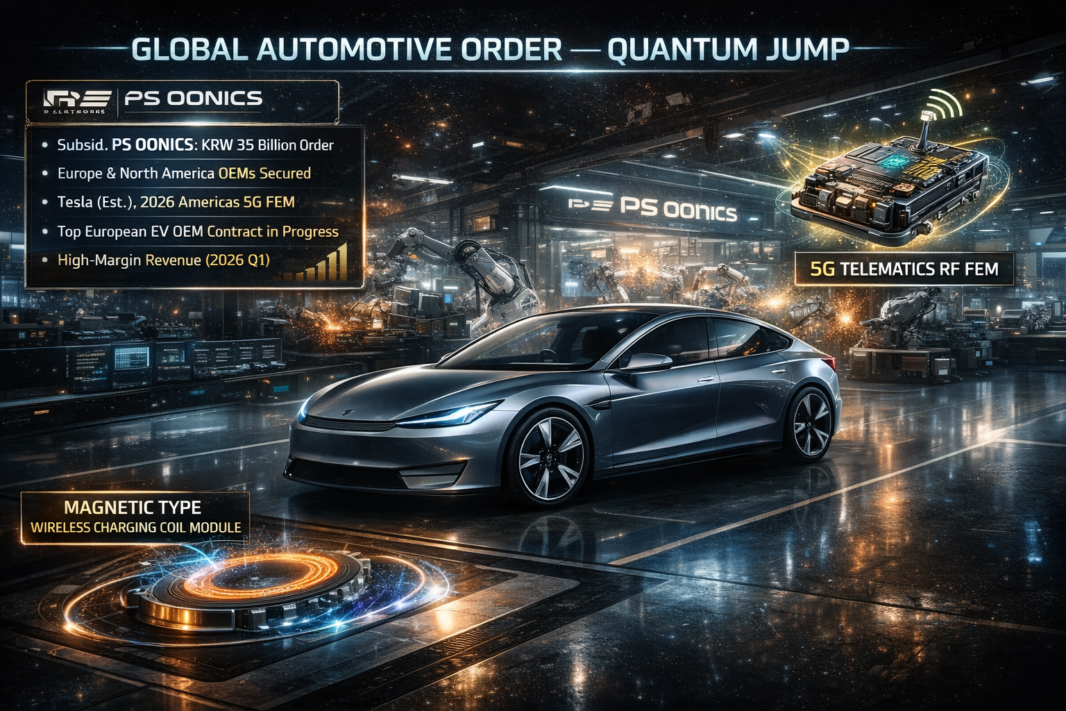 자회사 PS오닉스를 통해 유럽 및 북미 완성차 업체로부터 마그넷 타입 무선충전 코일 모듈 등 약 350억원 규모의 수주를 확보했습니다. 북미 최대 전기차 업체(테슬라로 추정)의 2026년 미주 모델 전체에 5G 텔레매틱스 RF FEM 수주가 확정됐으며, 유럽 전기차 1위 완성차와도 공급 계약이 진행 중입니다. 2026년 상반기부터 본격 매출로 인식되며 기존 스마트폰 부품 대비 월등히 높은 영업이익률이 적용됩니다.