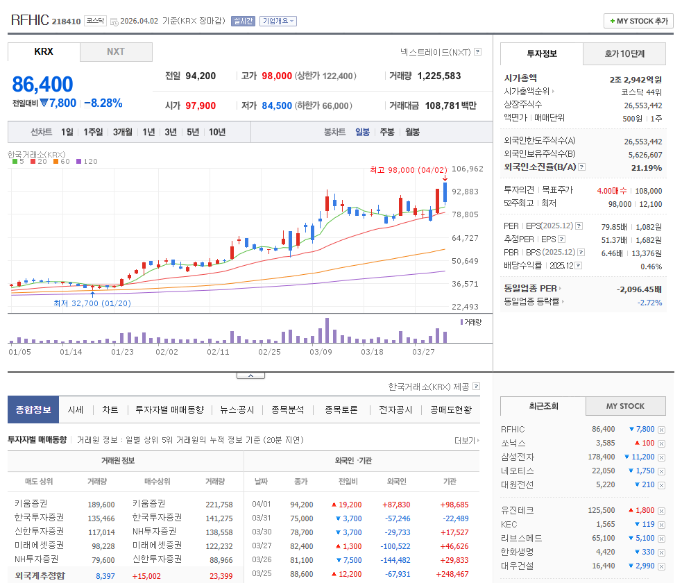 안녕하세요. 오늘은 2026년 4월 현재, 국내 통신장비 및 방산 섹터에서 가장 유의미한 기술적 변곡점을 만들어내고 있는 RFHIC(218410)에 대한 심층 분석과 주가 전략을 다루어 보려고 합니다.