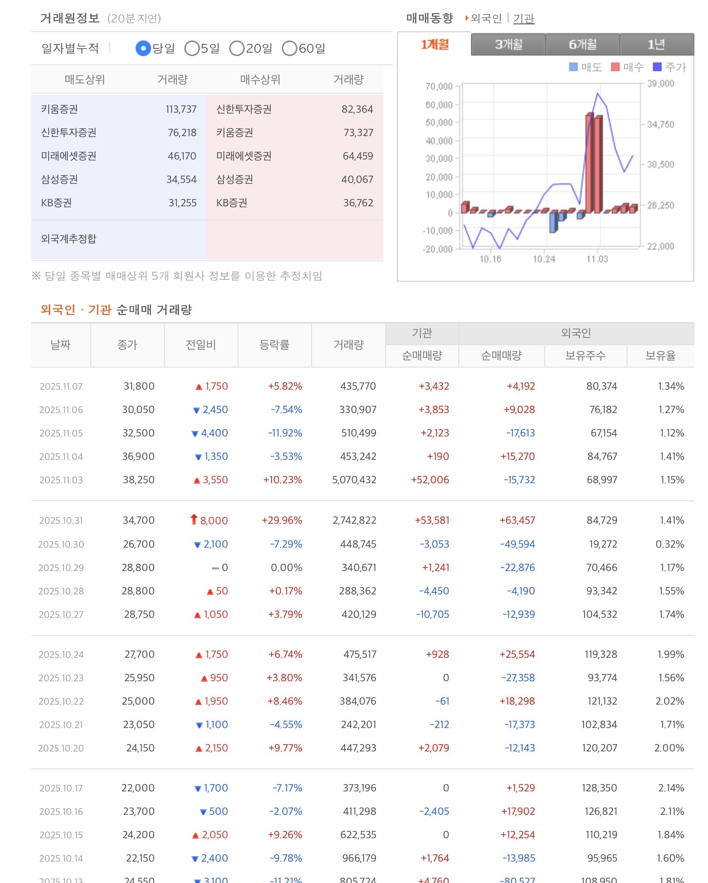 - 최근 종가: 약 31,800원 (2025년 11월 7일 기준)
