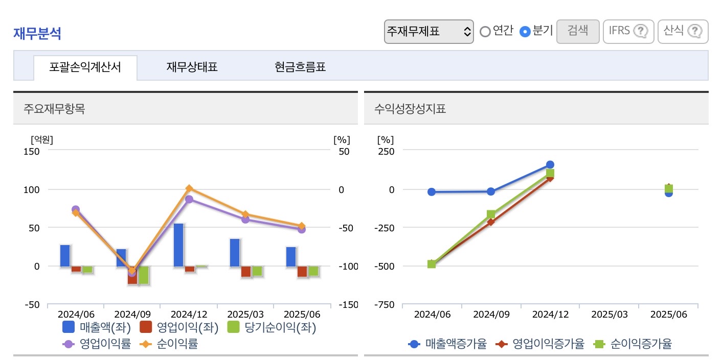 | 매출(연/반기) | 소규모(예: 수십억원 수준) | 규모가 작아 실적 변동성 큼 |