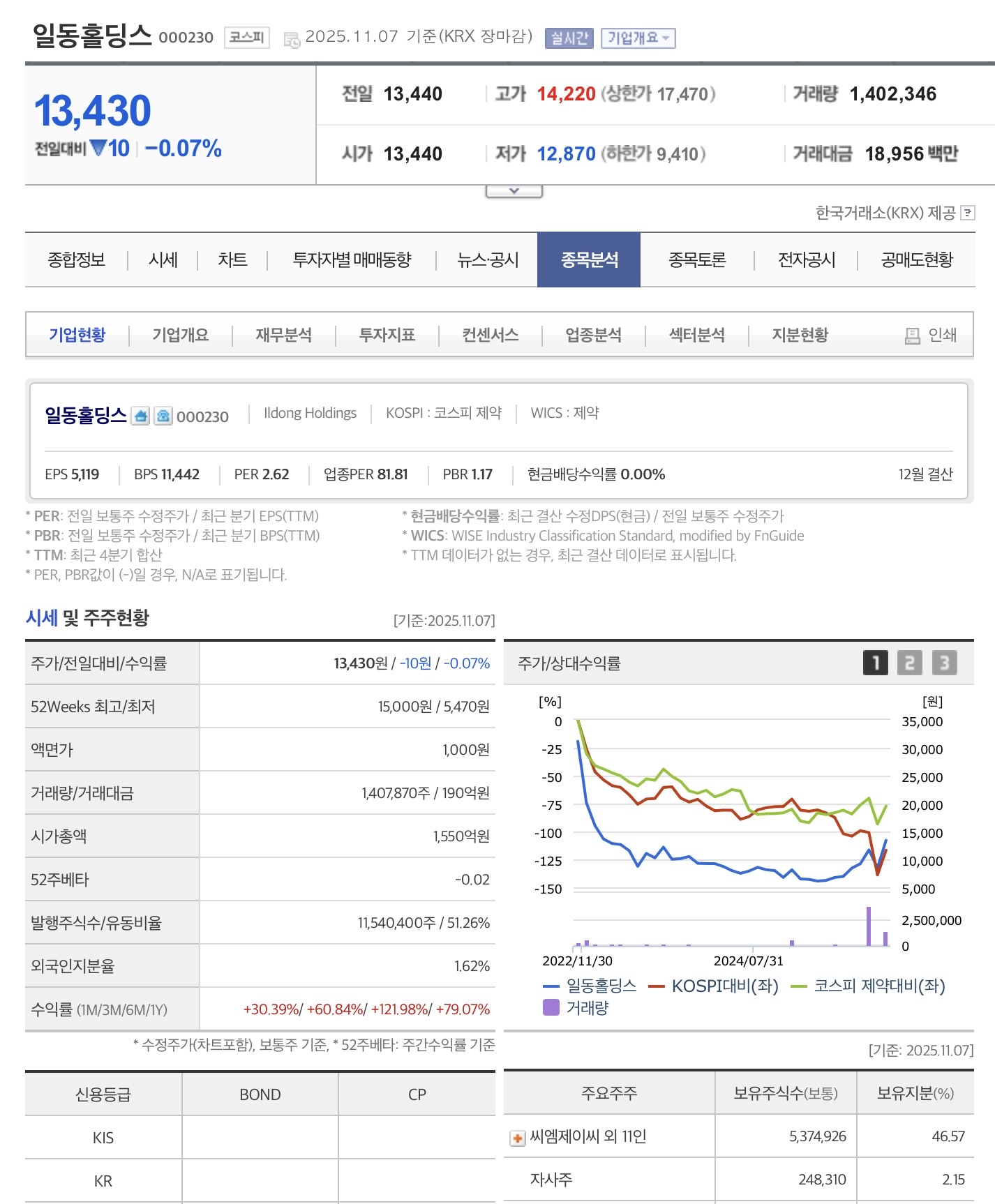 제약·헬스케어 계열 지주회사. 2025년 11월 초 특정일에 강한 수급(상한가·대량거래)이 유입되어 단기 모멘텀 형성. 밸류(저PER)가 낮아 단기 트레이드 기회가 존재하나, 장기적 가치는 사업성 개선 여부에 좌우.