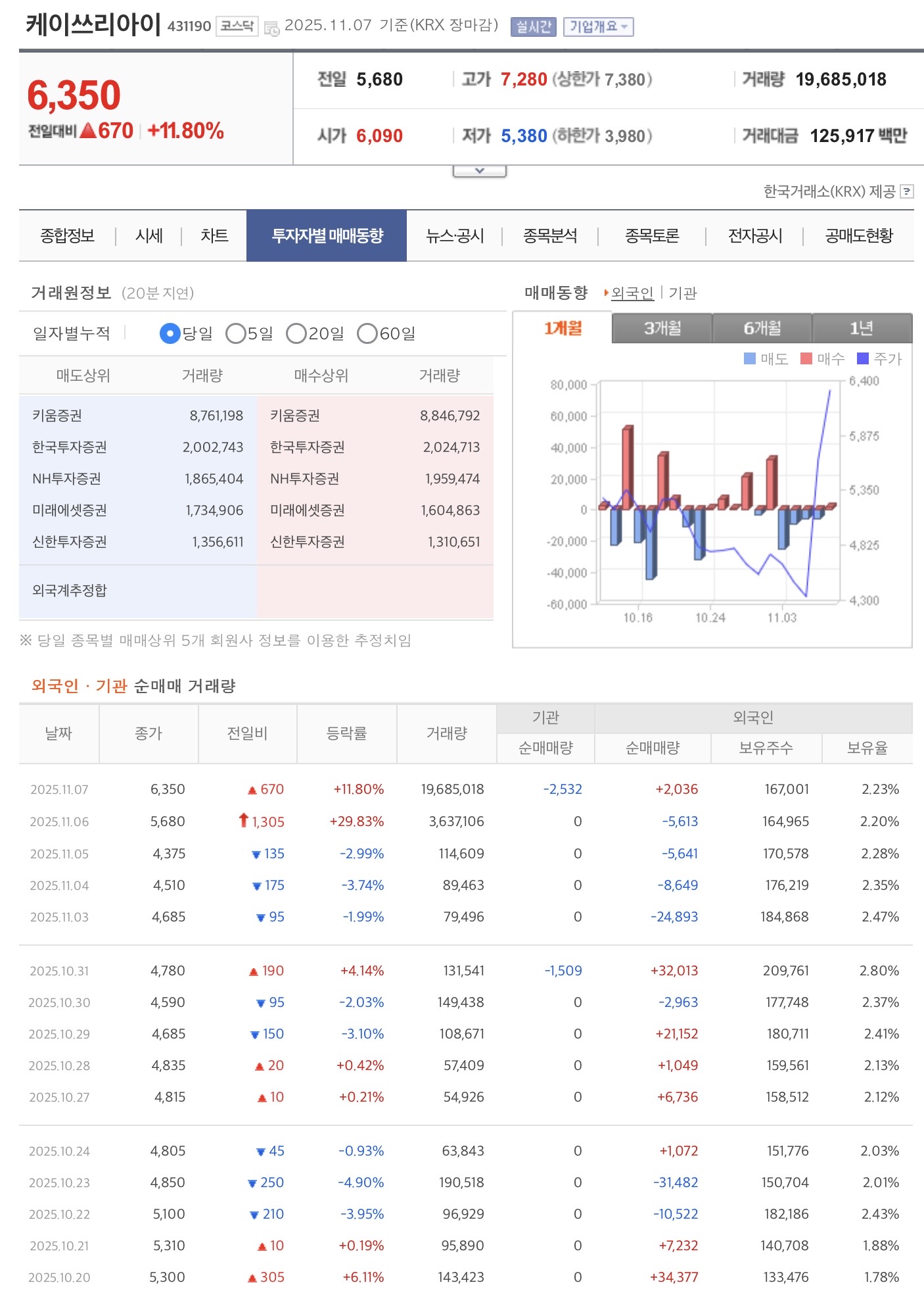 - 일부 대량 거래·유통물량 대비 거래 집중으로 '수급 유입' 형태 포착되었으나, 외국인·기관의 지속적 순매수 기반 여부는 미확인.
