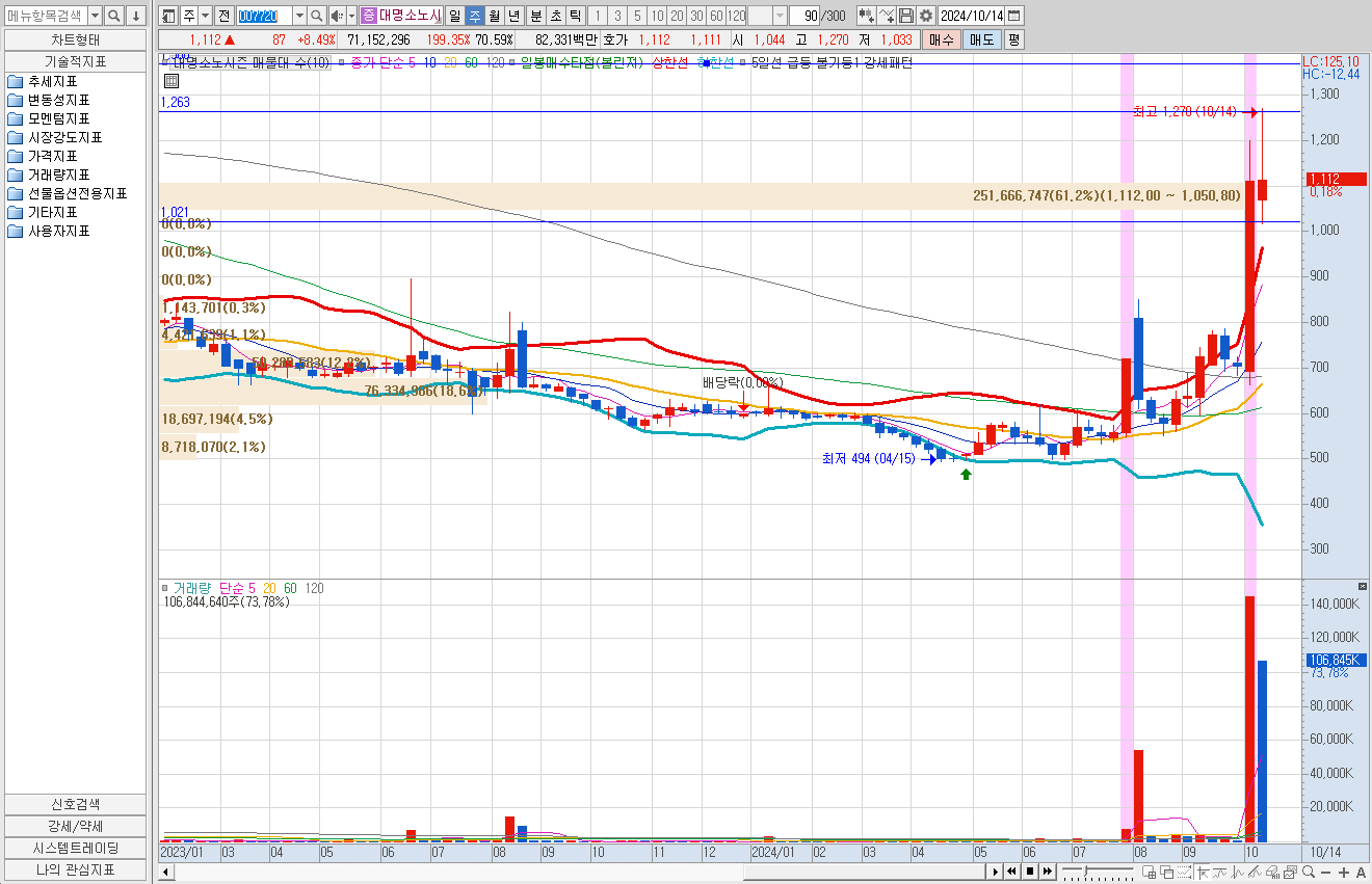 하지만 14일 장시작하고 윗꼬리를 달고 하락 마감, 하지만 금일 1,270원 23%급등을 하였다. 최대주주 소노인터내셔널, 에어프레미아 2대주주 지위 확보 및 티웨이항공 경영권 분쟁 모멘텀 지속되면서 급등하였다. 저점대비 30%정도 수익권, 단기과열종목예고이니 조심해야한다.