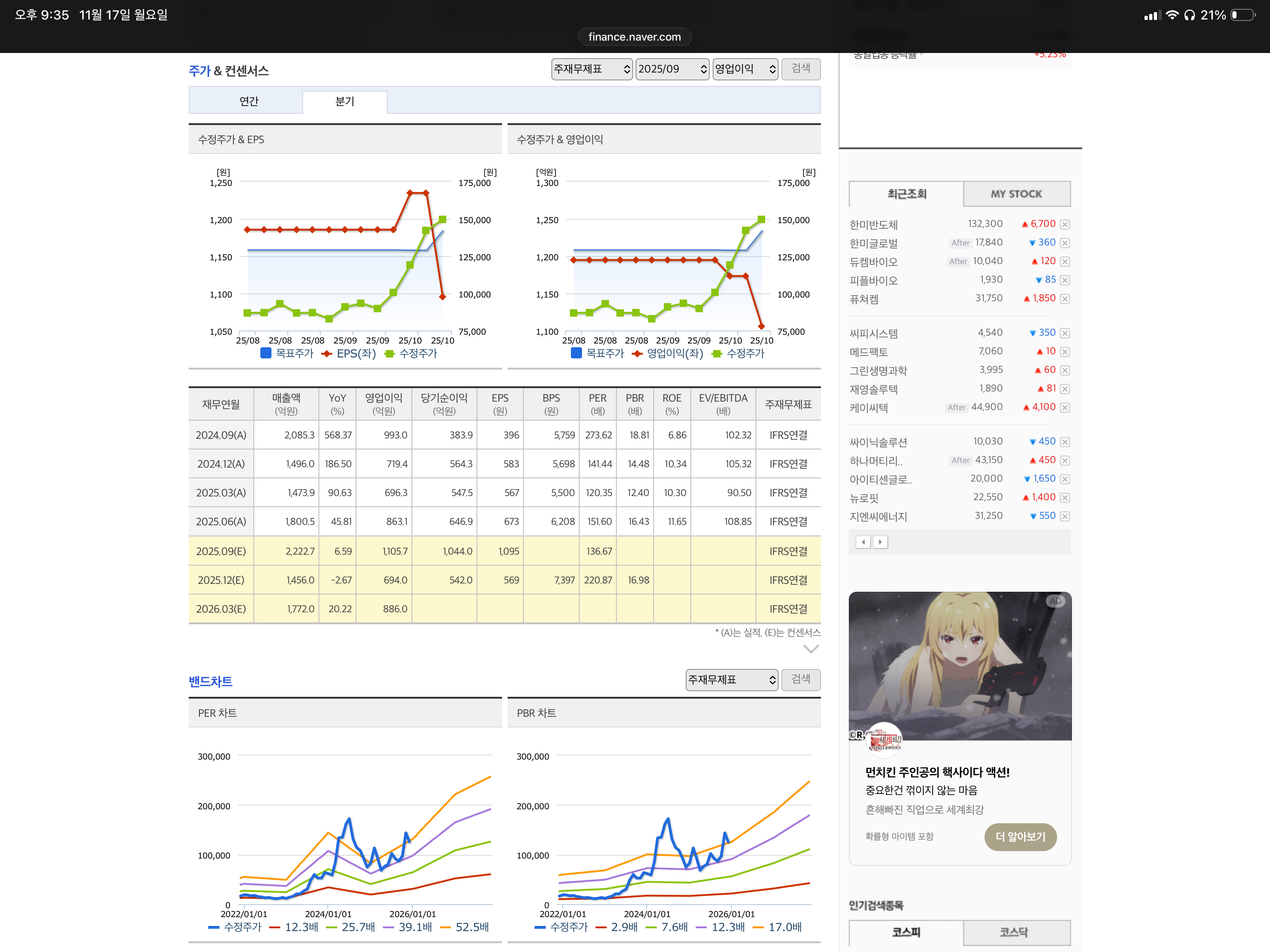 | PBR (주가순자산비율) | 상대적 고평가 구간 | 기술력과 성장 잠재력으로 인해 순자산 대비 높은 평가를 받고 있음 |