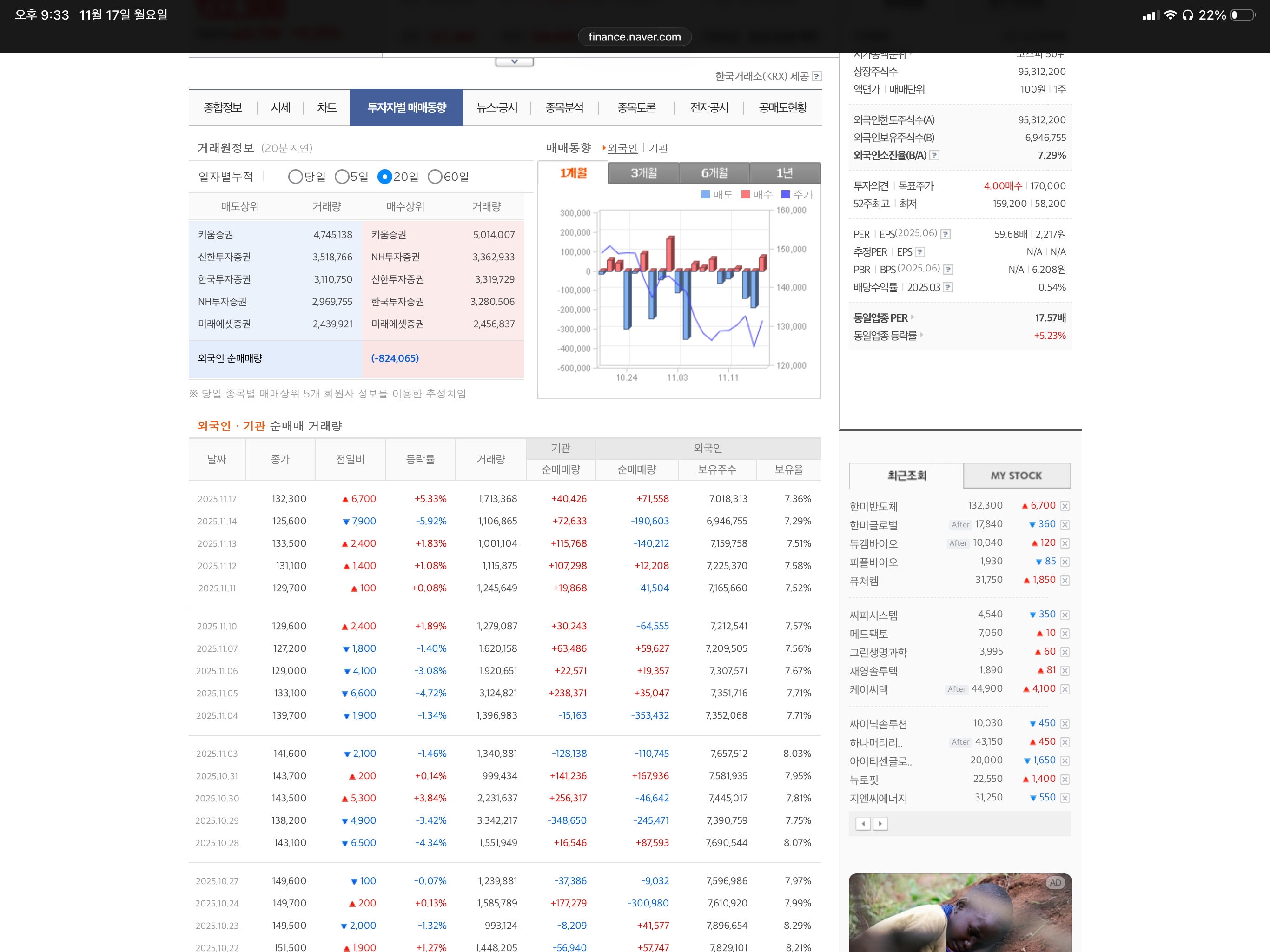 | 최근 수급 동향 | 외국인/기관 대량 매수 | HBM 섹터의 구조적 성장과 함께 외국인 및 기관의 대표적인 매수 선호주로 자리매김 |
