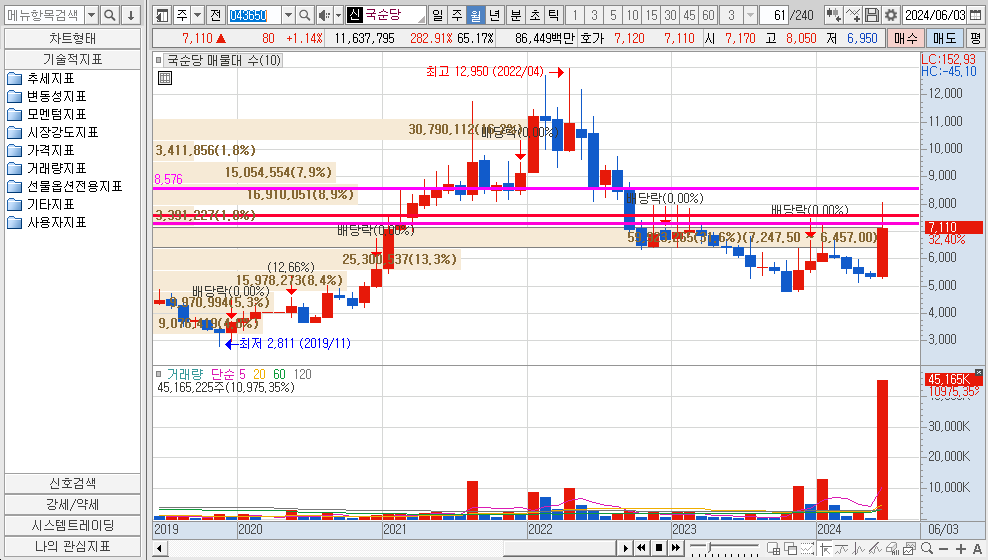 6월 11일에 수급이 들어오고 현재는 박스권을 형성하고 있다. K-푸드가 계속해서 이슈가 되고 있고 실적이 뒷받침을 하고 있으니 8500원은 무난히 가지 않을까 싶다. 이번주 한번 기대해볼만하다.