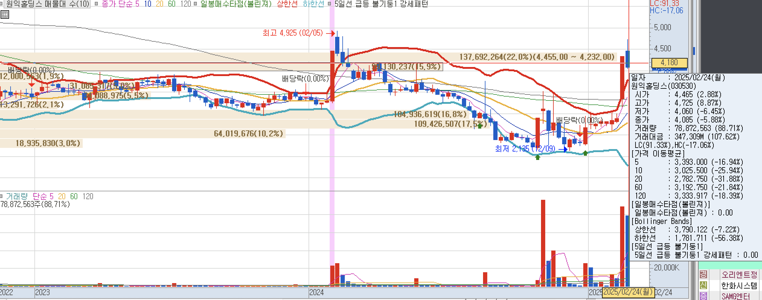 -원익홀딩스: 시가 4,465으로 시작하여 고가 4,725원 8.87%상승하였다. 전주 금요일에 상한가로 마무리 하여 상승을 이어갔다 레인보우로보틱스가 조정을 받자 로봇 관련주로 같이 하락하였다. 원익그룹 계열사로 기존 원익IPS에서 투자사업과 TGS(Total Gas Solution) 사업이 분할돼 변경상장된 업체로 독자적 사업을 갖고 있는 사업형 지주회사. 반도체 및 디스플레이 제조공정 중 해당 공정에 필요한 원료 가스를 원하는 조건(압력)으로 안전하고, 청청이 유지된 상태에서 원료가스의 순도가 보존된 상태로 공급시키기 위한 장치제조 사업을 영위. 주요 종속회사로 산업용가스제조업을 영위하는 원익머트리얼즈와 레저 및 임대관리업을 영위하는 원익엘앤디를 보유하고 있다.
