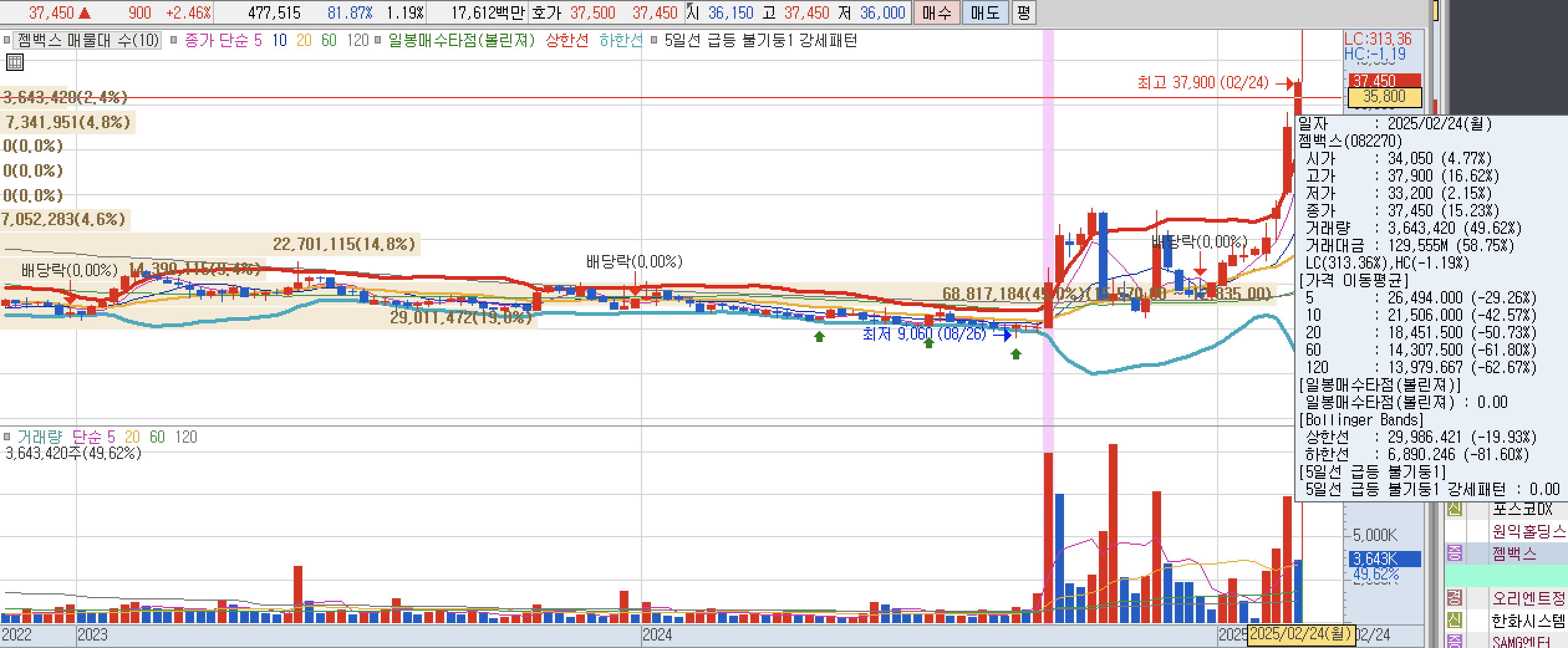 -젬백스: 시가 34,050원으로 고가 37,900원 16.62% 상승하였다. 환경오염제어사업 및 바이오 사업(항암 및 항염)을 영위. 반도체/디스플레이분야 오염제어용 CA Filter와 Gas Scrubber Resin 제품 및 환경오염방지 및 유해가스제거장치 등을 개발 및 제조, 판매. 바이오 사업부문에서는 텔로머라제 유래 펩타이드 기반 신약물질 GV1001로 알츠하이머병, 전립선 비대증 등 다양한 적응증의 국내외 임상시험 2상, 3상 등을 진행 및 준비중. 미국의 자회사인 TELOID Inc.(전 Epimmune)을 통해인플루엔자백신 및 말라리아, 에이즈, 간염, HPV백신 등 감염성 질환 백신 기술을 보유/개발중. 이외에도 삼성제약, 포니링크 등을 계열회사로 보유 중이다.