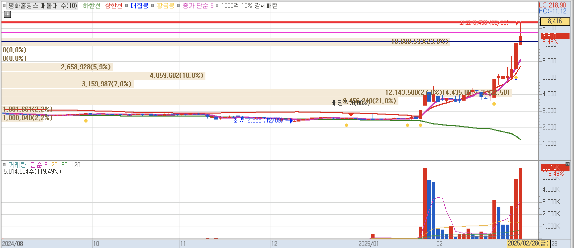 -평화홀딩스:지난 주에 (+46.97%) 상승하였다. 김문수 장관 범여권 차기 대권 지지율 1위 소식에 김종석 회장 같은 경주 김씨 부각 되면서 크게 상승을 하였다. 탄핵 심판의 결과가 나오기 전까진 계속해서 상승을 할 수 있을 것으로 생각이든다. 정치테마가 요즘엔 크게 잘 움직이는 듯하다. 다음주에도 8,416원가진 올라 갈 수 있을 것으로 예상된다.