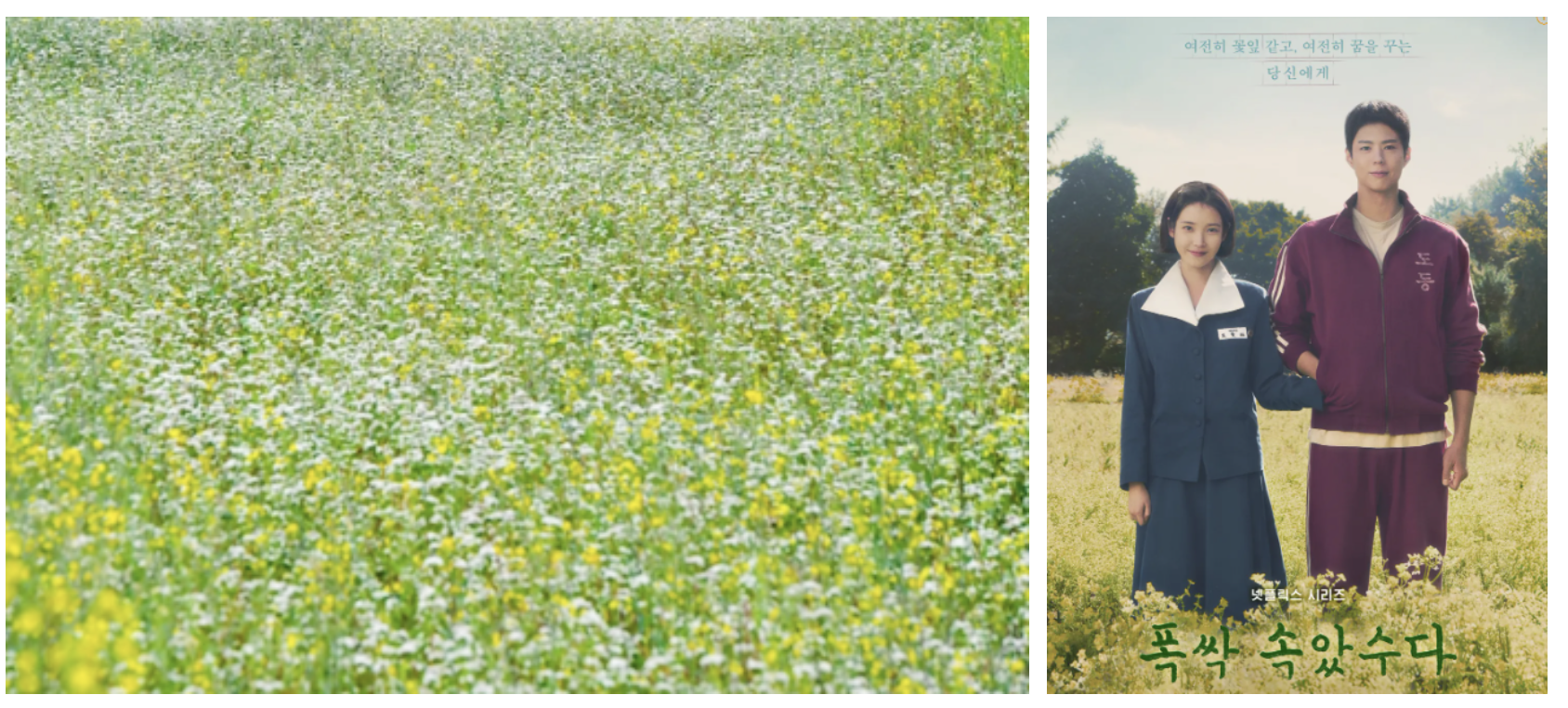 애순과 관식의 로맨틱한 장면이 촬영된 유채꽃밭은 전북 고창에 위치해 있습니다. 유체꽃이 나오니 당연히 제주에서 촬영했을 것이라 생각했겠지만 그렇지 않다. 제주 가시리 녹산로의 유채꽃 배경을 CG로 합성하여 아름다운 장면을 연출하였다고 한다.